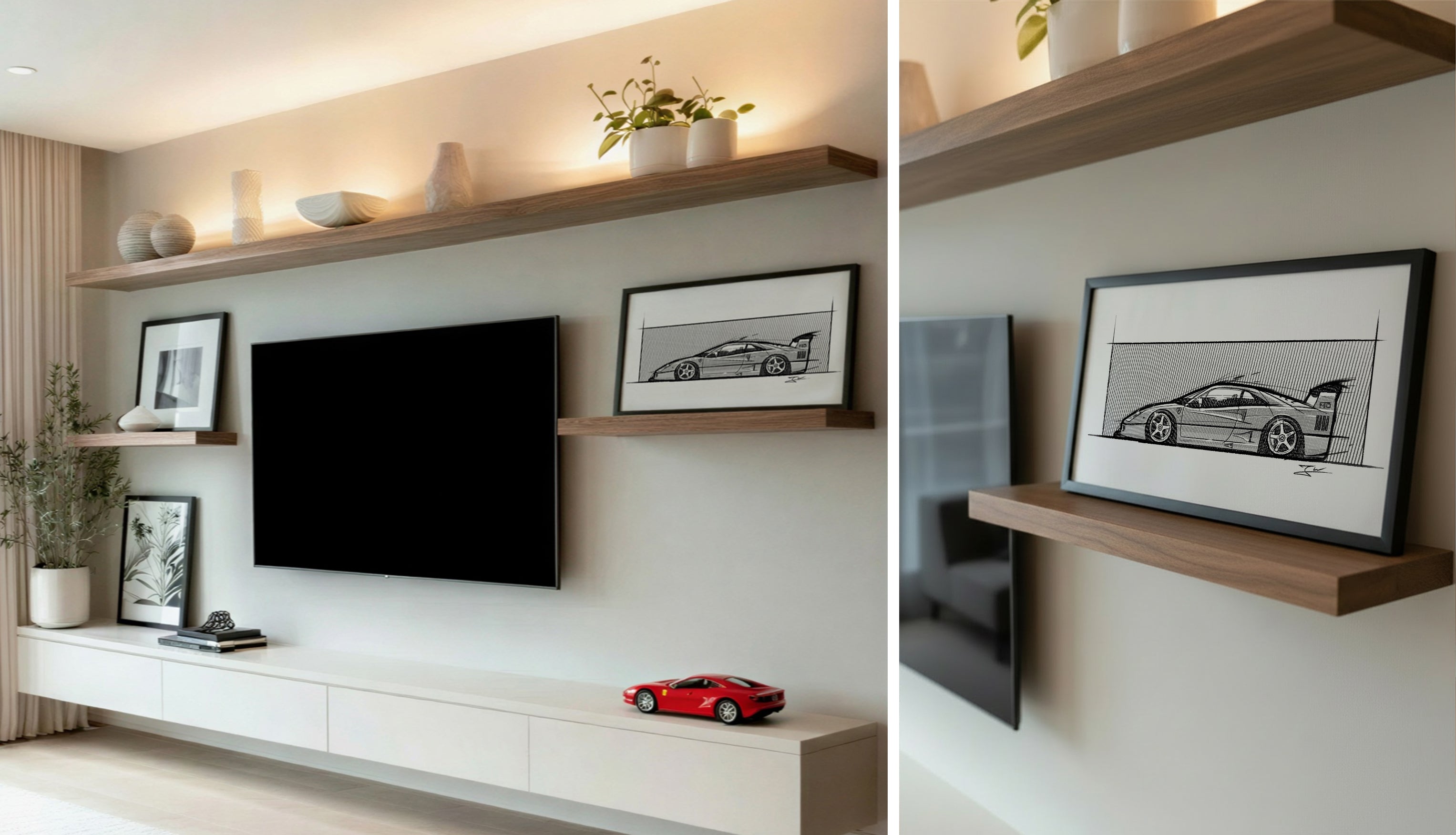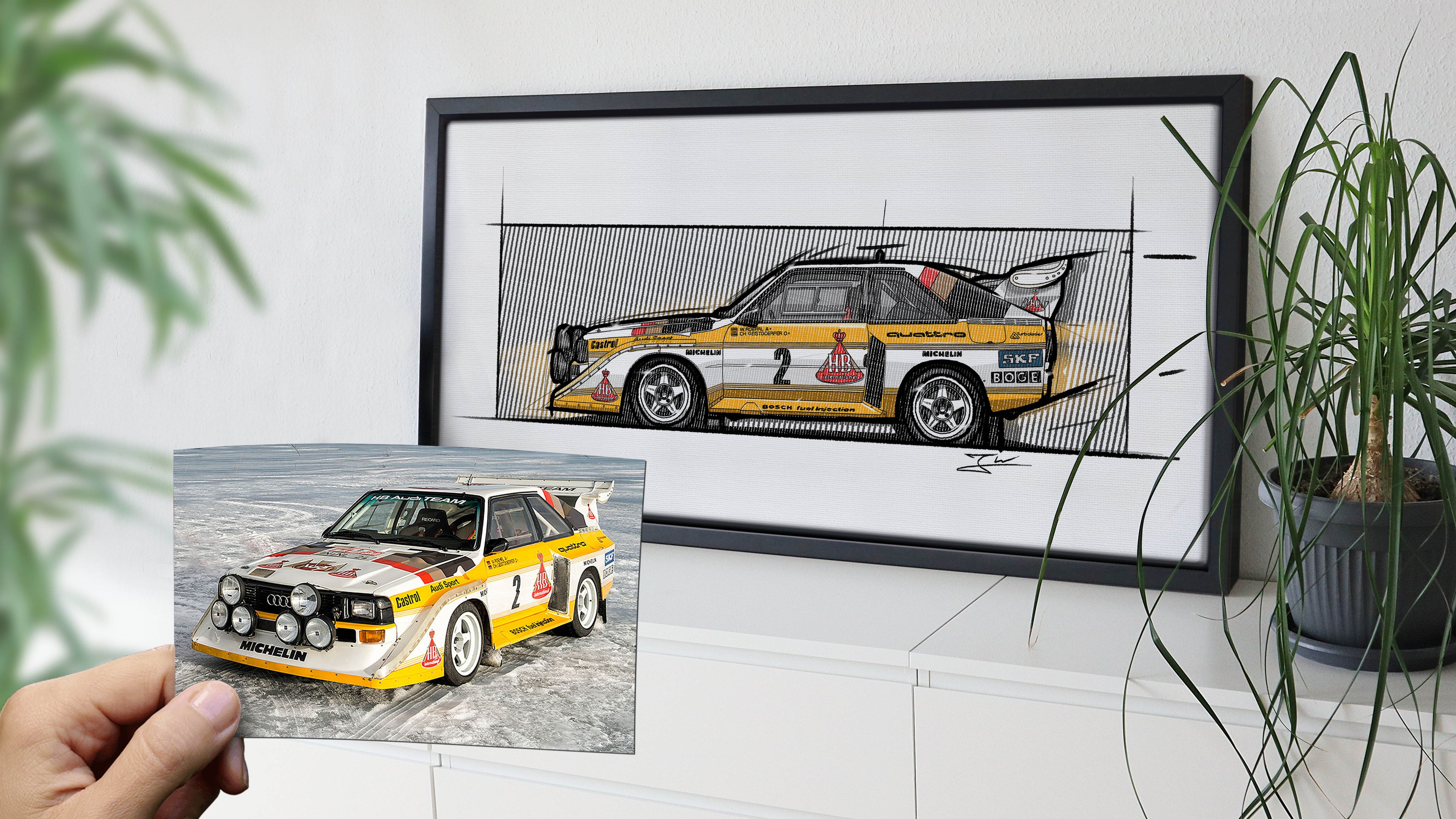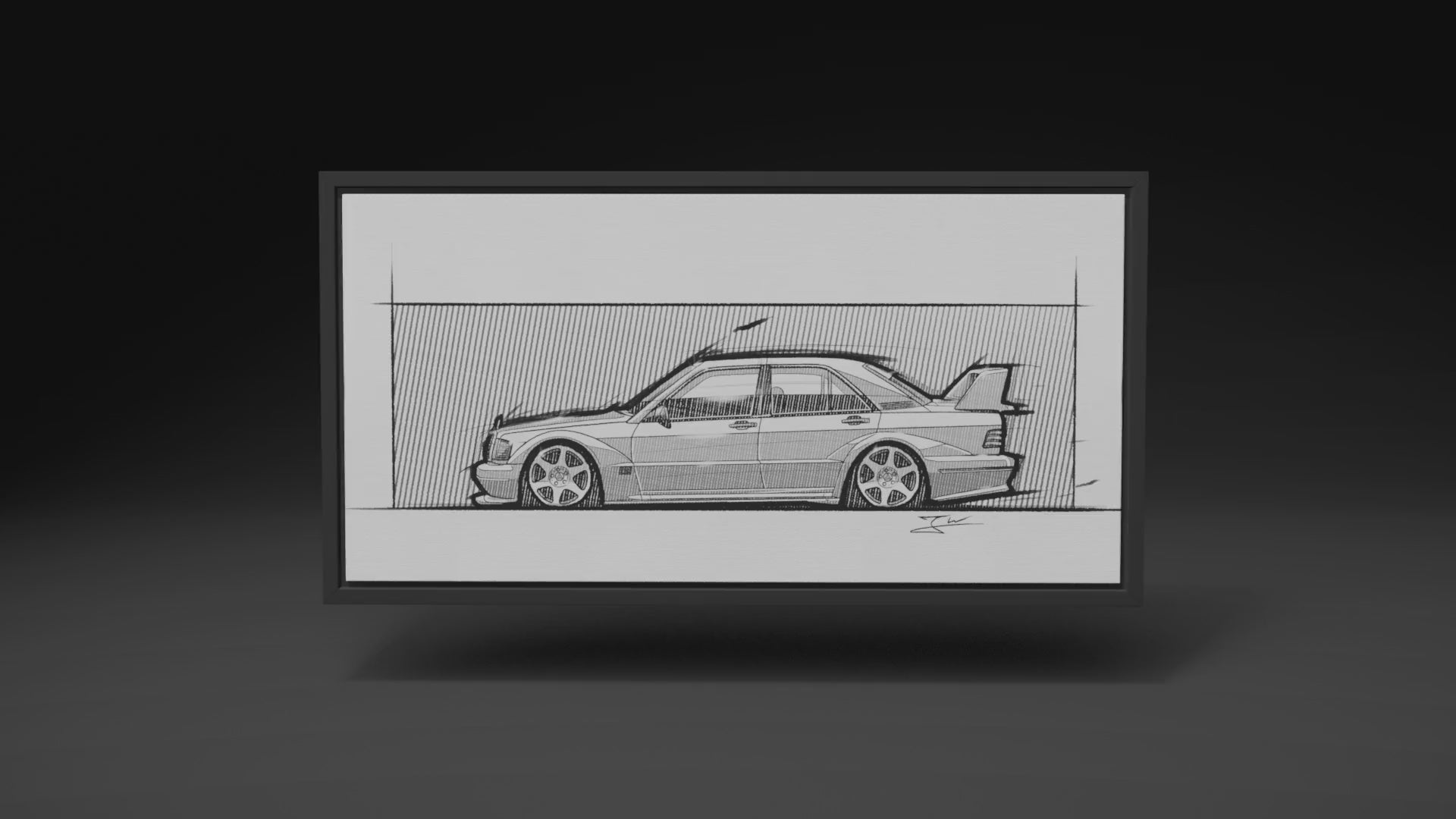 Jedes Automobil ist ein Kunstwerke, in dessen Entwicklung allerhand Designverständnis und Ingenieursarbeit geflossen ist. Diesen Geist und diese Seele möchten wir mit unseren minimalistischen Designskizzen wiederspiegeln. Daher werden unsere Bilder nicht einfach nur im Posterformat gedruckt, sondern auf Leinwand gespannt und im edlen Schattenfugenrahmen präsentiert.
