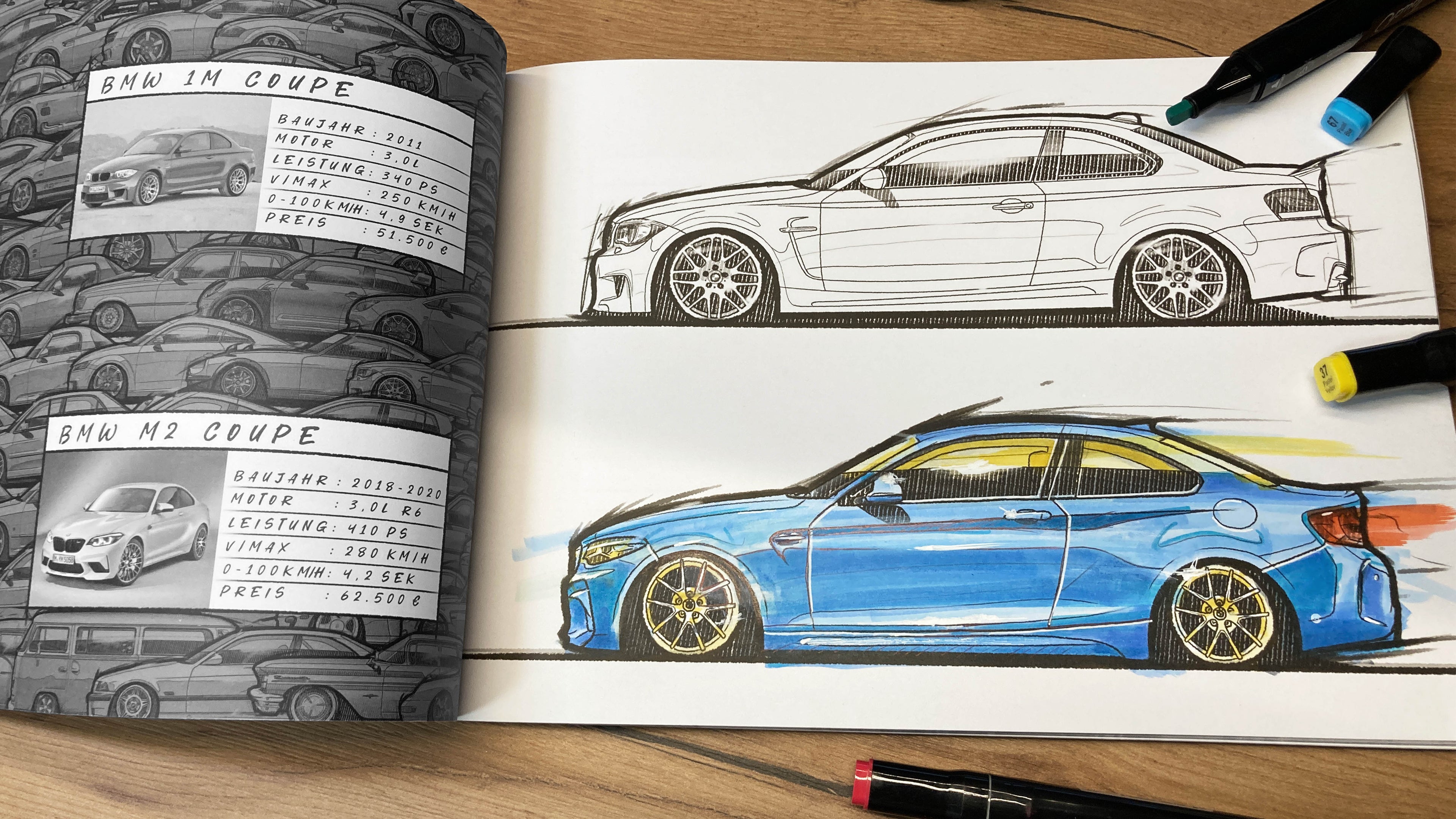nahezu alle Automarken vertreten, sodass für jeden etwas dabei ist. Ein Ausmalspaß nicht nur für Kinder. Zusätzlich zu den Ausmalmotiven sind technischen Daten zu jedem Fahrzeug wie bei einem Quartett aufgelistet. Gedruckt ist das Buch auf 120g starkem Naturpapier, sodass man es hervorragend mit Bunt- und Filzstifte, sowie Markern bemalen kann. Die Rückseite jeder Innenseite ist dunkel gestaltet, sodass ein Durchmalen vermieden wird.